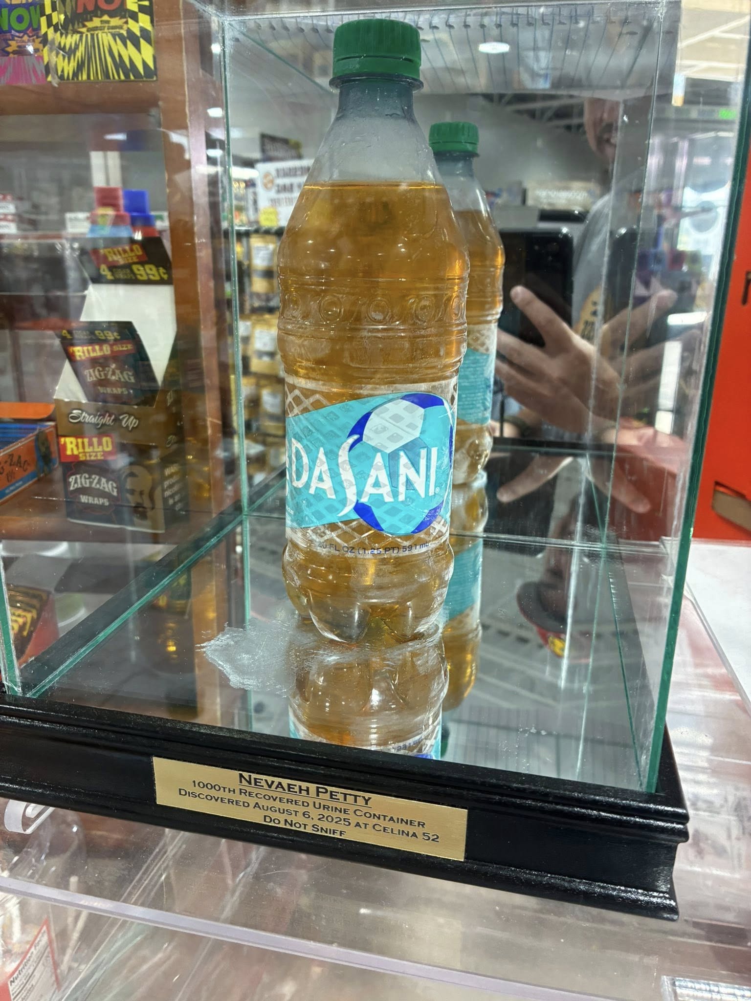 On a hot day on August 6th, 2025 , I collected my 1000th Urine Container from the Celina 52 Truck Stop parking lot. I've been here for years, and I never thought the day would come. They even enshrined the 1000th Piss Jug in a glass trophy case! You can come by 1897 Genesis Road in Crossville for yourself and come take a picture with it!